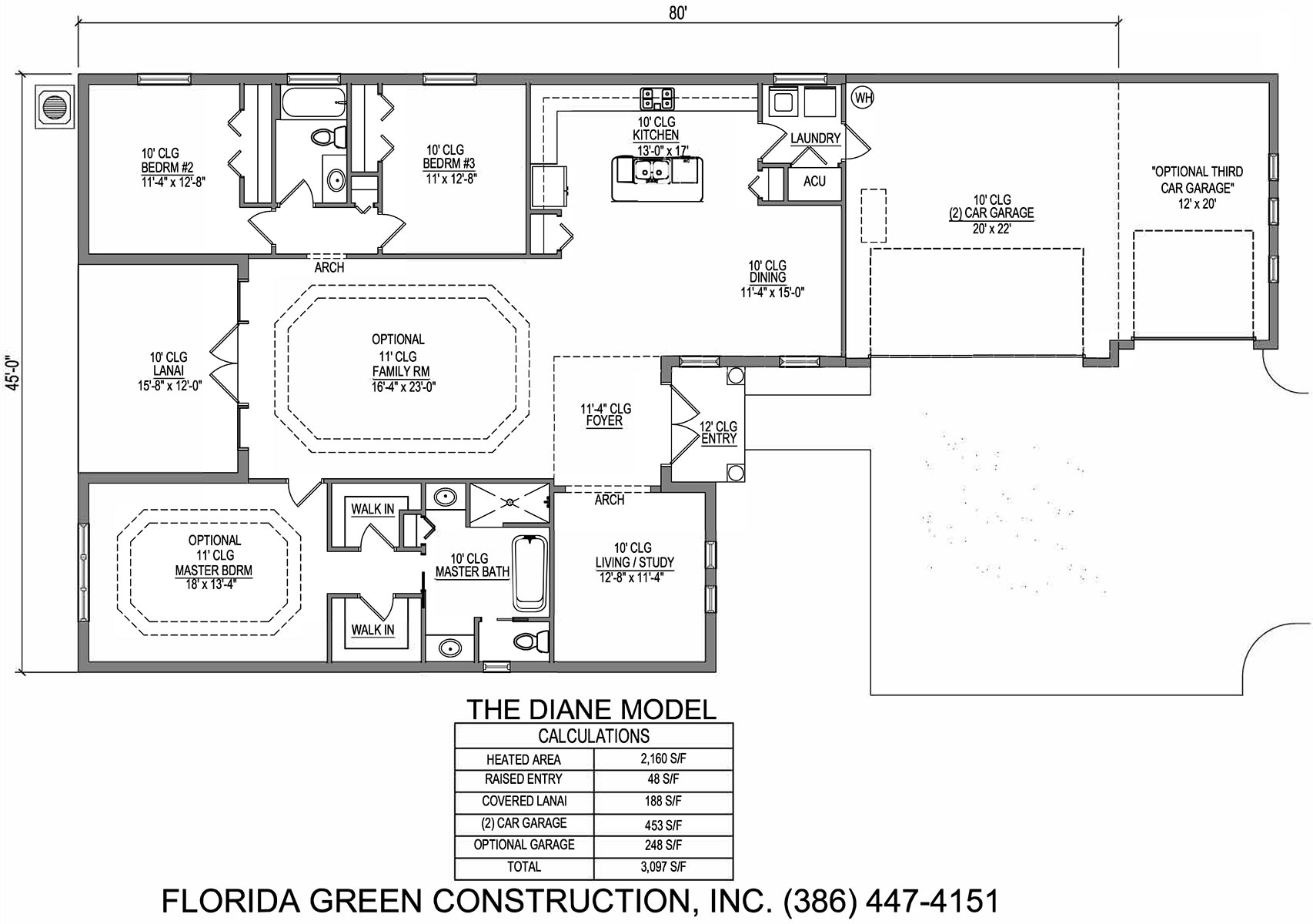 The Diane is elegant and comfortable, with 2,160 SF of living area and 2,849 SF under roof. A split floorplan with an open and bright interior. Three-bedroom two bath with optional study/ fourth bedroom and side entry garage. Luxurious kitchen: high quality 42 in wood cabinets with crown molding above and soft close European hardware, granite counter tops, stainless steel appliances, microwave vented outside. Kitchen island includes double sink, dishwasher and pull out trash can. Tile and laminate flooring throughout.