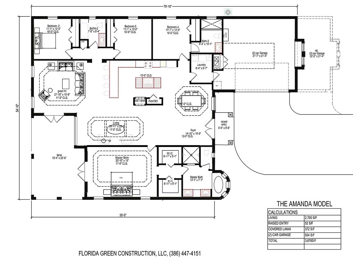 The Amanda is elegant and comfortable, with luxury interior features. 10 feet ceilings that extend to 12 feet in some areas, & decorative trays. A split floorplan with an open and bright interior 8 feet exterior and interior doors. Four bedrooms, three en suite bathrooms, covered lanai and side entry garage.